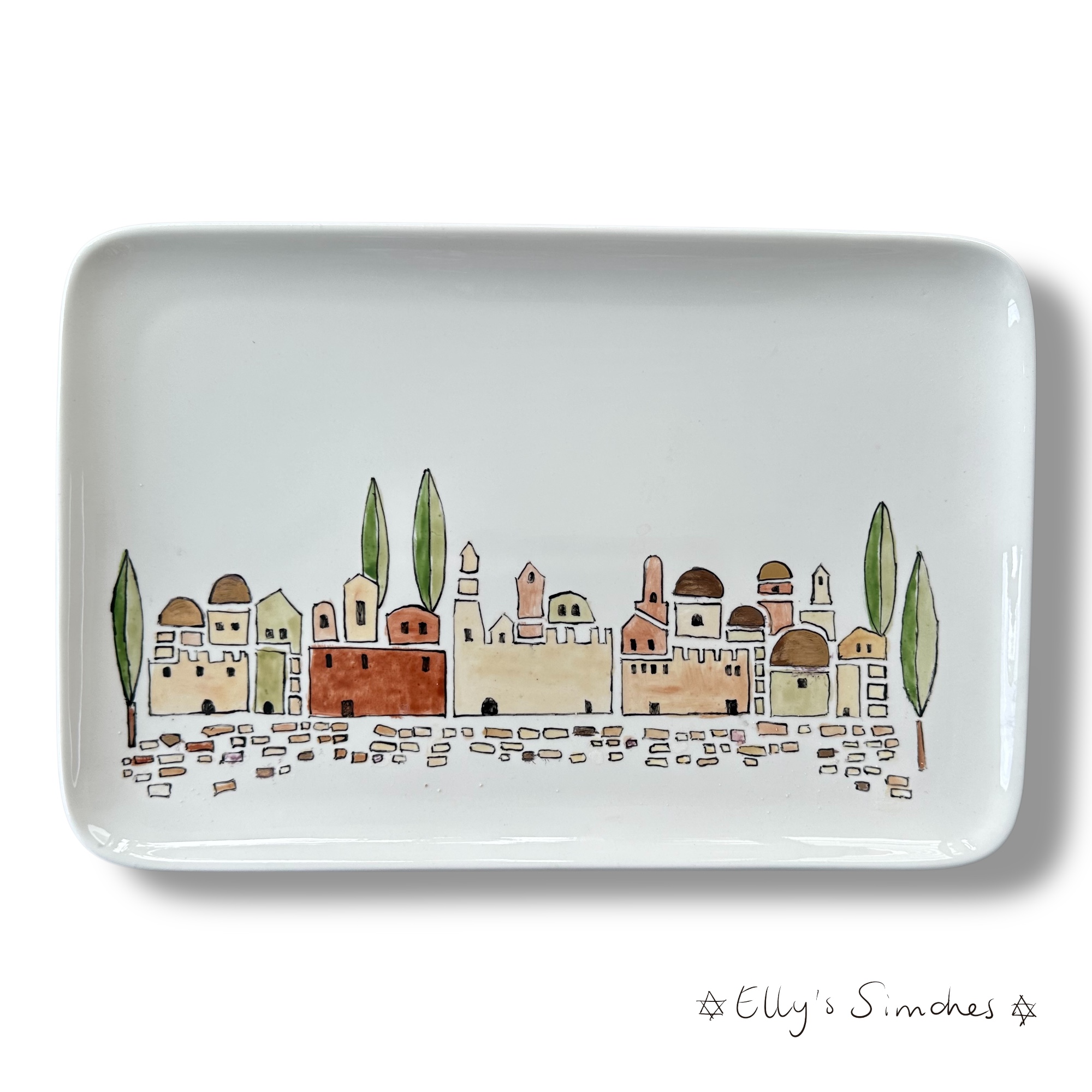 Deze rechthoekige serveerschaal van zware kwaliteit keramiek is een kunstwerk op zich. Het ontwerp toont een sfeervol stadsgezicht van Jeruzalem, met hoge cipressen en karakteristieke gebouwen. Subtiele accenten in echte gouden keramiekverf geven de schaal een warme glans en maken elk exemplaar uniek en luxe.
